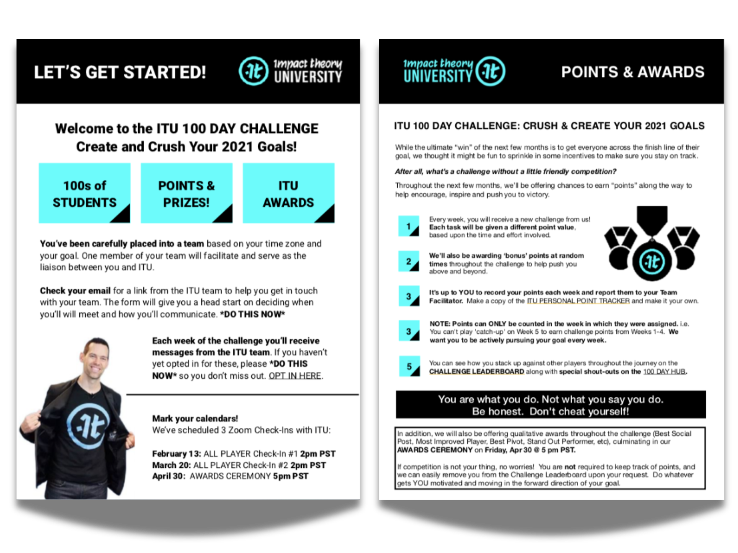 Below: First round 100 Day Challenge for retention boosting, later changed to 90 Days. Completely built and led high-touch challenge that hosted over 700 people worldwide in localized teams.